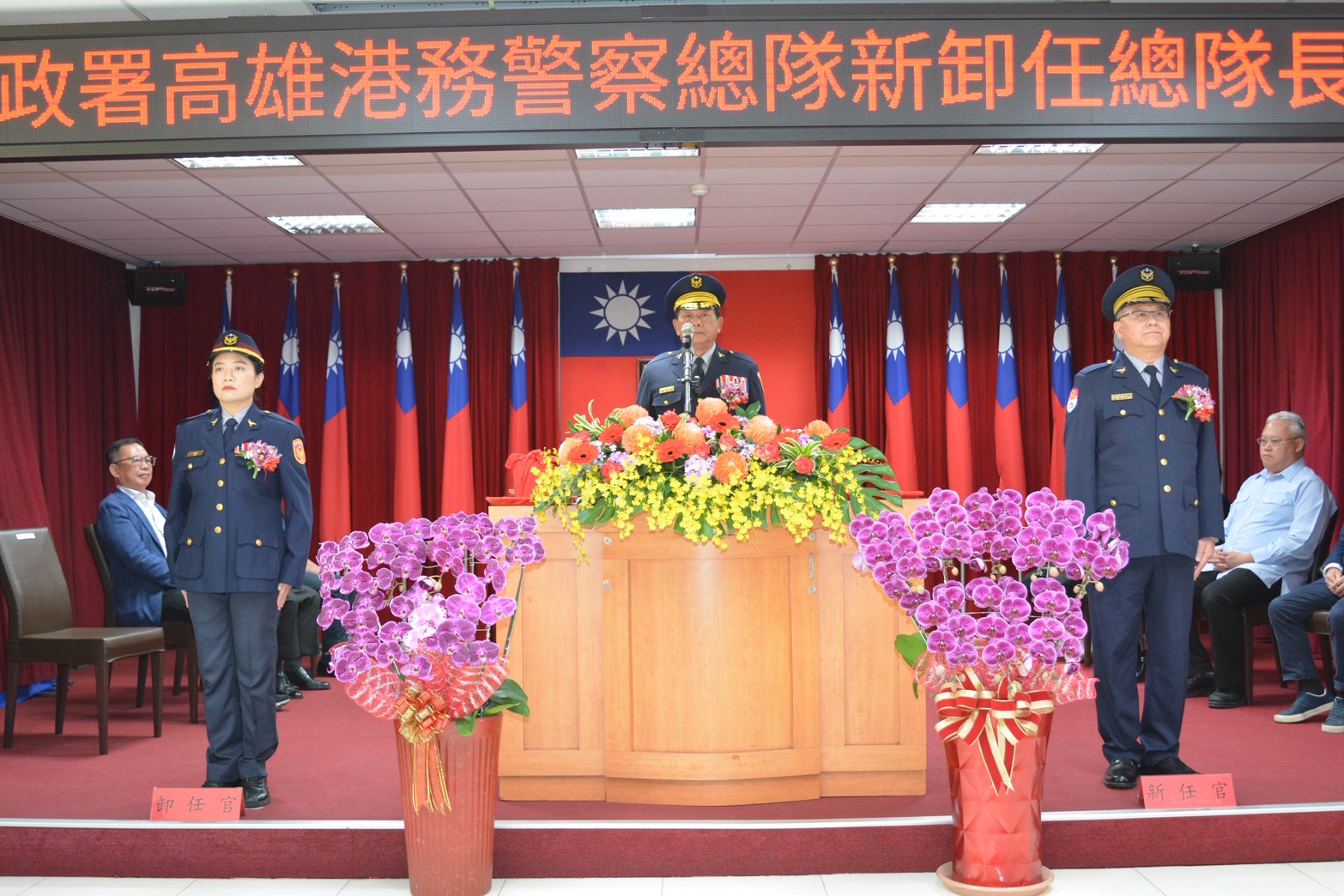 內政部警政署高雄港務警察總隊於今(20)日上午11時,在該總隊禮堂舉行新卸任總隊長交接典禮,由警政署副署長李文章親臨主持監交,原任總隊長朱信憲調任警政署行政組組長,由副總隊長楊肇萍代理卸任,將印信交給新任總隊長廖國政,儀式簡單隆重,有臺灣港務股份有限公司副總經理陳中龍、臺灣港務港勤股份有限公司總經理鄭淑惠、交通部航港局南部航務中心副主任許東男、法務部調查局航業調查處高雄調查站主任李青憲、財政部關務署高雄關副關務長高丁財、穩發漁業股份有限公司董事長謝龍隱、海洋委員會海巡署第七巡防區指揮部部主任張宏裕等多位港航各界貴賓到場觀禮祝賀。