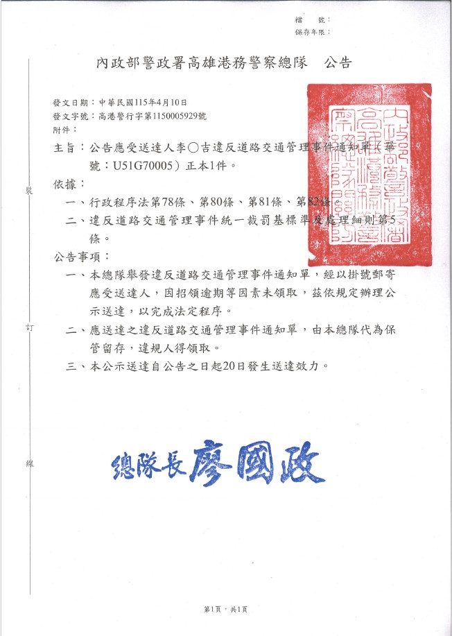 公示送達本總隊第U50320968、U50321028、U50321272、U50321510、U50321456、U50321281號交通違規通知單案